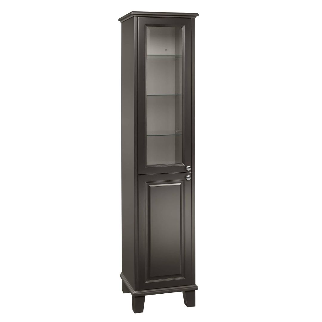 Módulo columna reversible con patas, puerta con cristalera y estantes de cristal regulables en altura. Dispone de iluminación LED interior y cierre soft-close.