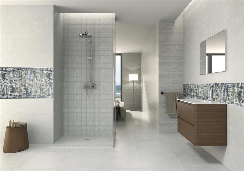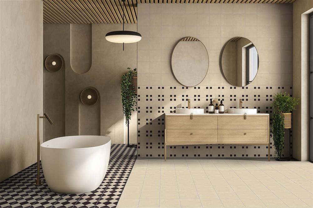 - Azulejo efecto cemento + blanco mate → baño urbano y minimalista.