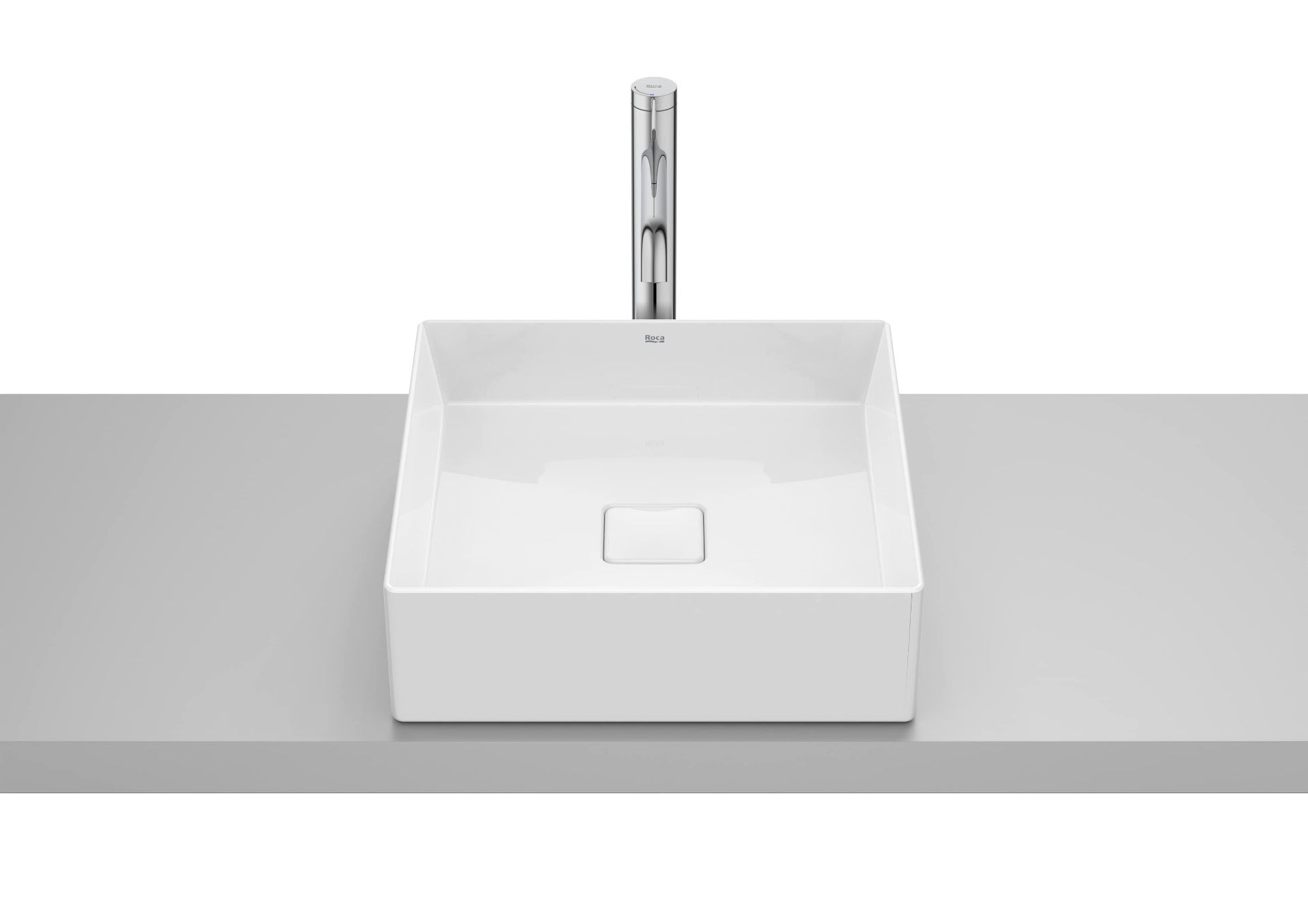 Lavabo de fineceramic® sobre encimera modelo TERRA, acabado blanco. Medida 400x400 mm. No incluye grifería ni desagüe.