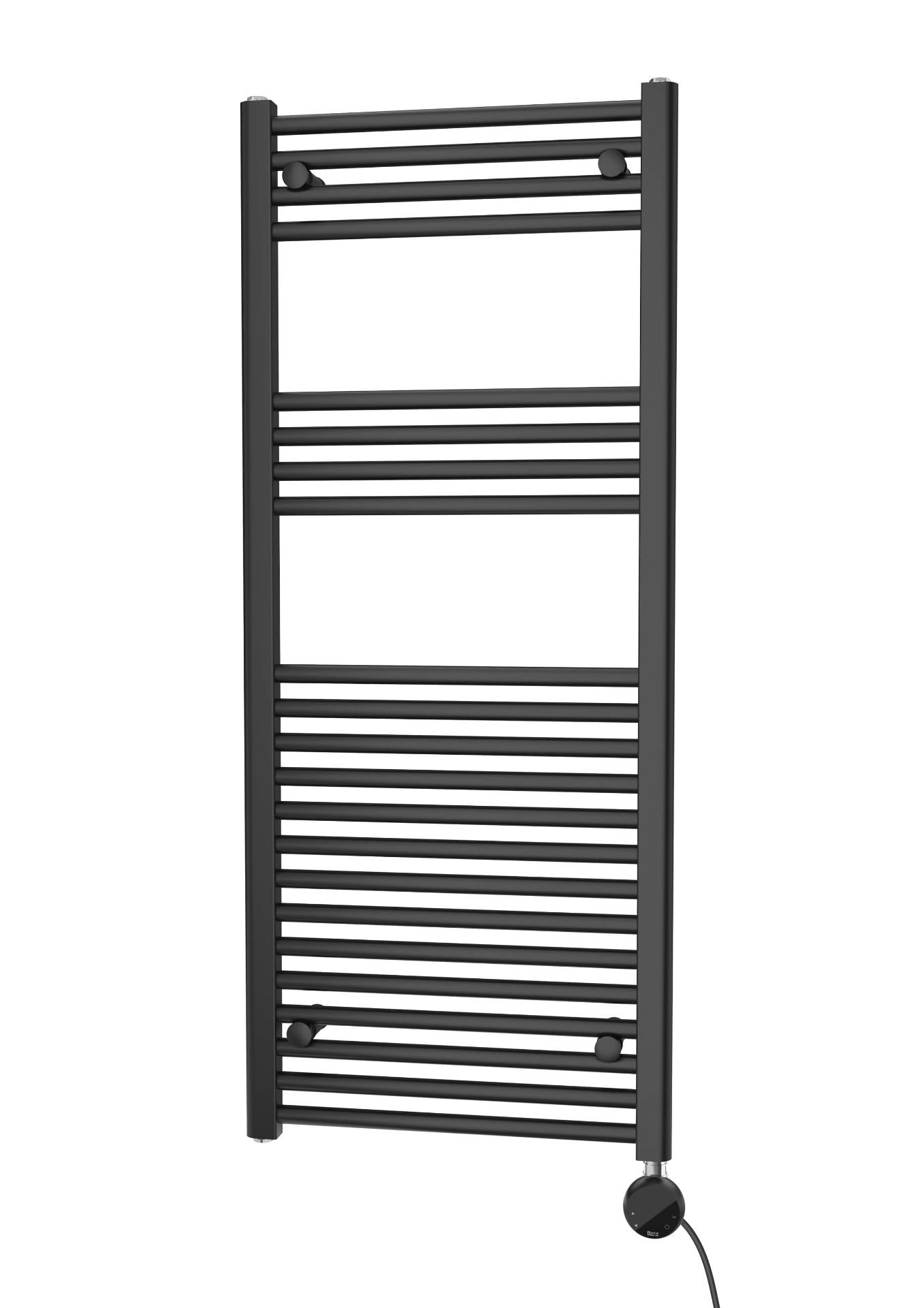 Radiador toallero eléctrico VICTORIA-N. Acabado negro mate, medida 1200x500. Con termostato 3 funciones: 4 niveles de temperatura, temporizador de potencia con auto-off. Potencia 300W. Bajo consumo durante modo reposo.Con kit montaje.Potencia 500W